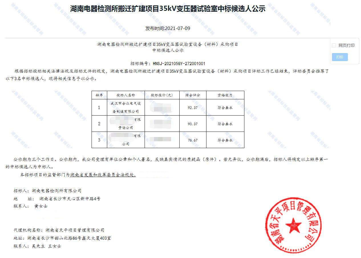 近日湖南電器檢測所35kV變壓器試驗室項目招標候選結果公示發布,根據招投標相關法律法規及招標文件規定,湖南電器檢測所35kV變壓器試驗室設備(材料)采購項目評標工作已經結束,評標委員會推薦的中標候選人相關信息已公示,武漢市合眾電氣設備制造有限公司以公示排序第一中標人中標。