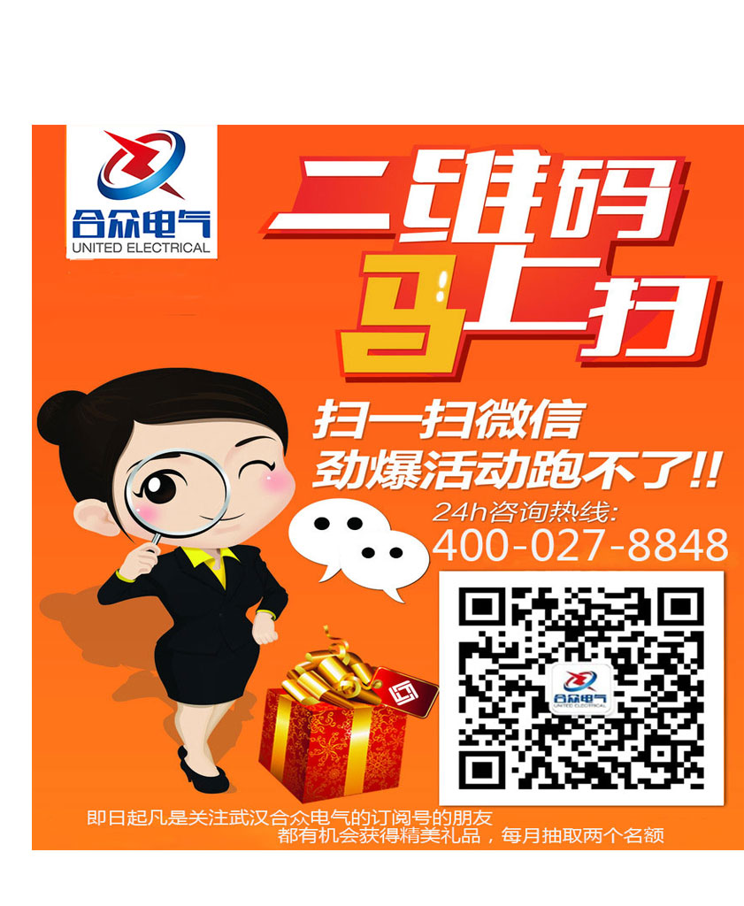 為了讓每位關(guān)注合眾電氣的朋友能在第一時間了解公司的動態(tài),獲得線上支持,同時也是為了更好的服務(wù)于廣大新老客戶。因此決定推出:掃微信二維碼,贏精美禮品的活動。即日起凡是關(guān)注合眾電氣訂閱號的朋友都有機會獲得我們精心準(zhǔn)備的精美禮品,每月抽取兩個中獎名額!我們會在每個月的12號公布獲獎名單,歡迎大家踴躍參與!