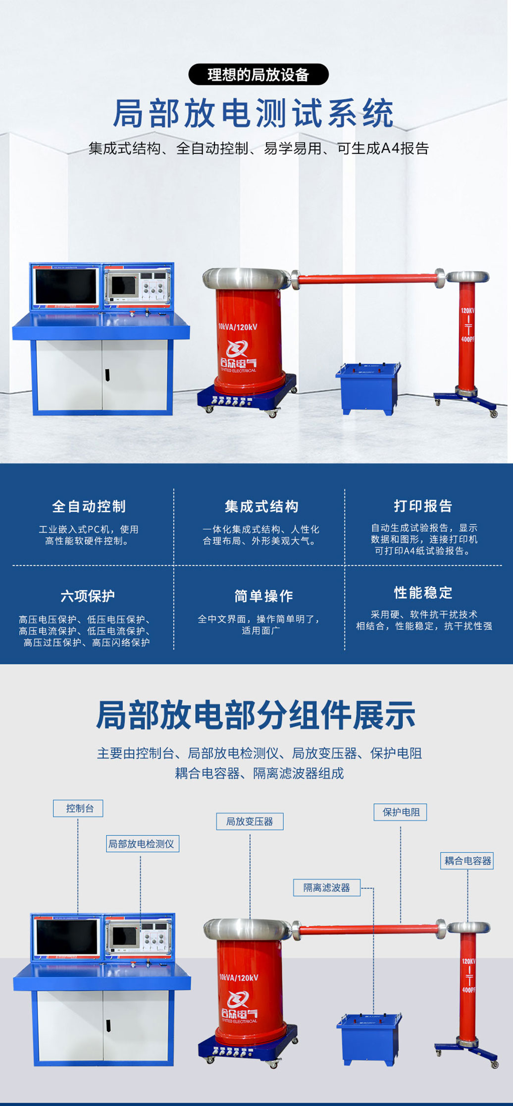 *全自動無局放耐壓試驗裝置,適用于供配電系統,電力變壓器制造廠、工礦企業、科研部門等,對各種高壓電氣設備、電器元件、絕緣材料進行工頻或直流高壓下的絕緣強度試驗,是高壓試驗中必不可少的重要設備。廣泛適用于變壓器、互感器、高壓開關、氧化鋅避雷器、電力電纜等各種高電壓電工產品的局部放電的測量,產品的型式試驗,絕緣的運行監督等。本儀器檢測靈敏度高,試樣電容覆蓋范圍大,適用試品范圍廣,輸入單元(檢測阻抗)配備齊全,頻帶組合多(九種)。儀器經適當定標后能直讀放電脈沖的放電量。指針式表頭和數字式表頭同時顯示,指針式表頭能按需要方便地選擇對數刻度或線性刻度指示。