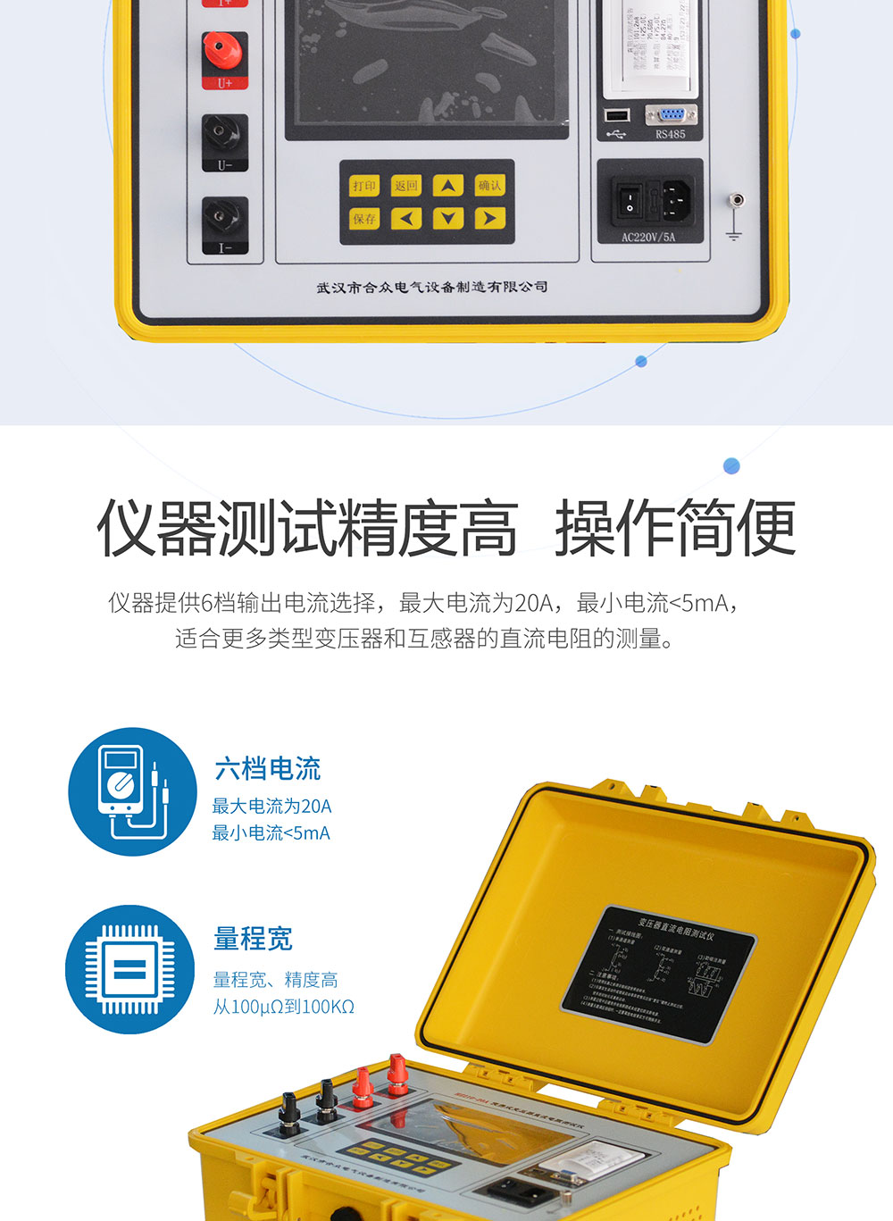 1、儀器提供6檔輸出電流選擇,最大電流為20A,最小電流<5mA,適合更多類型變壓器和互感器的直流電阻的測量。