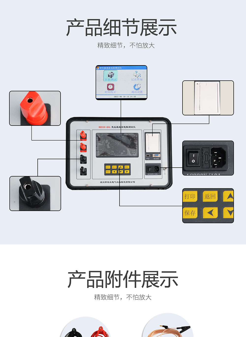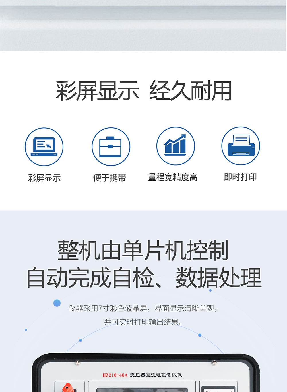 直流電阻的測量是變壓器、互感器、電抗器、電磁操作機(jī)構(gòu)等感性線圈制造中半成品、成品出廠試驗、安裝、交接試驗及電力部門預(yù)防性試驗的必測項目,能有效發(fā)現(xiàn)感性線圈的選材、焊接、連接部位松動、缺股、斷線等制造缺陷和運(yùn)行后存在的隱患。為了滿足感性線圈直流電阻快速測量的需要,我公司利用自身技術(shù)優(yōu)勢研制了直流電阻測試儀。該儀器采用全新電源技術(shù),具有體積小、重量輕、測試量程寬、抗干擾能力強(qiáng)、保護(hù)功能完善、大屏彩色液晶顯示等特點(diǎn)。整機(jī)由單片機(jī)控制,自動完成自檢、數(shù)據(jù)處理,具有自動放電和放電指示功能。儀器測試精度高,操作簡便,可實(shí)現(xiàn)直阻的快速測量。